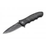 Rukojeť je z černého eloxovaného hliníku s vložkou ze 180vrstvého damašku. Se sponou na kapsy.
