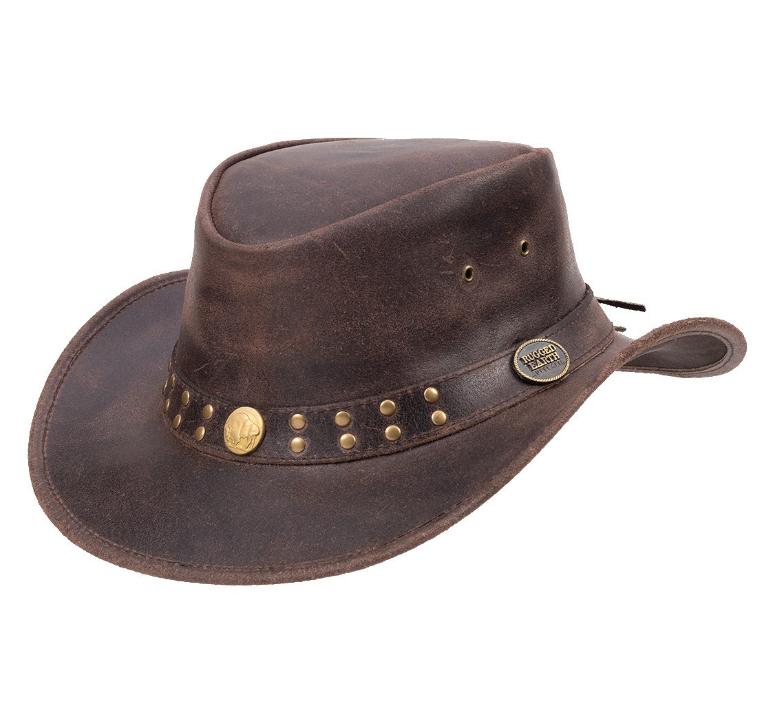 Klobouk je vyroben z pevné pravé hovězí kůže, která dobře drží tvar a zvládne i náročnější podmínky. Dominantním designovým prvkem je nýtovaná kožená stuha s kovovými detaily a logem Rugged Earth, které podtrhuje jeho drsný westernový a outbackový styl.