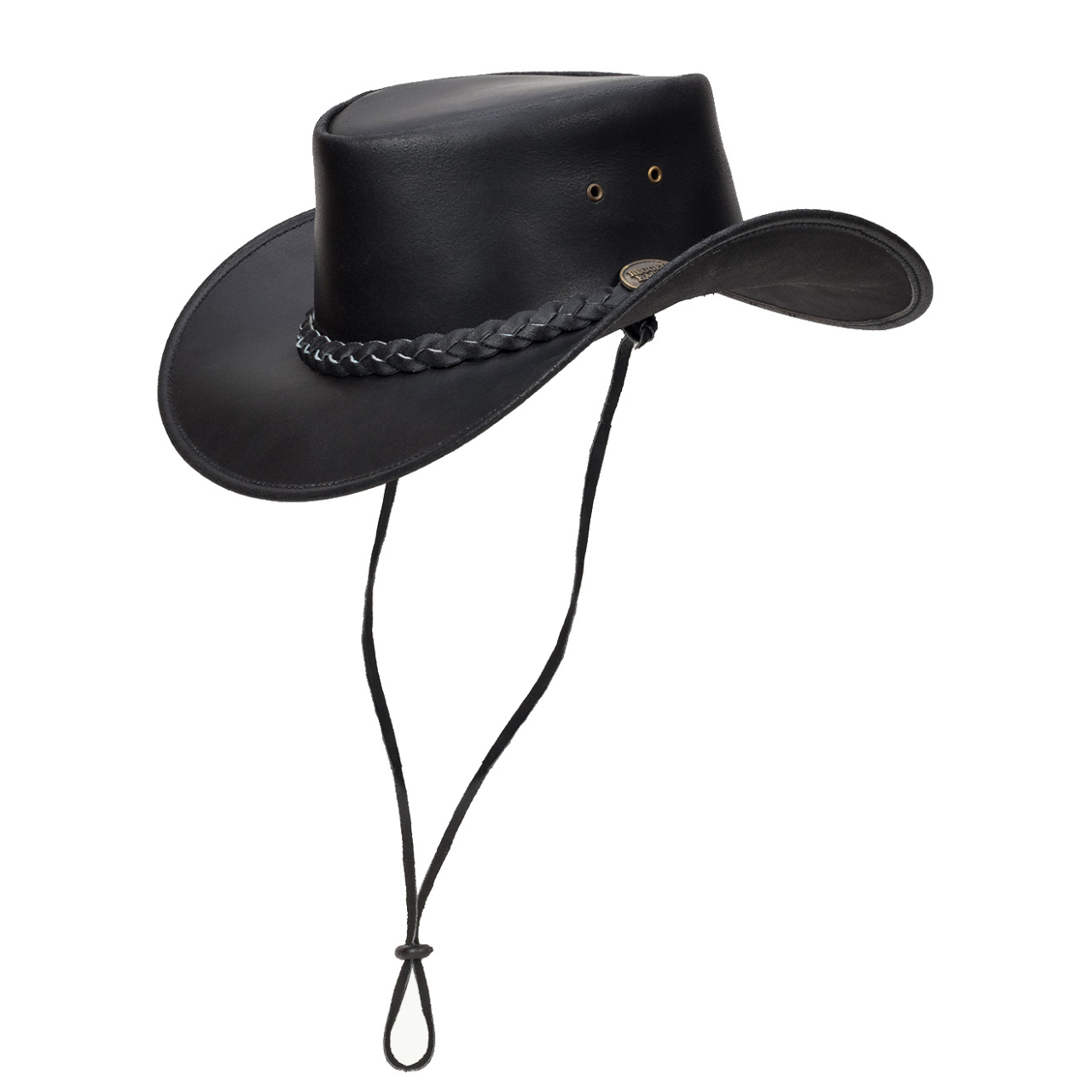 Robustní australský klobouk v outback stylu z pravé hovězí kůže, připravený na slunce, vítr i déšť. Široká krempa, pevná koruna, pletený kožený pásek a praktická šňůrka pod bradu z něj dělají spolehlivou volbu do přírody, na cestování i pro každodenní nošení ve městě.