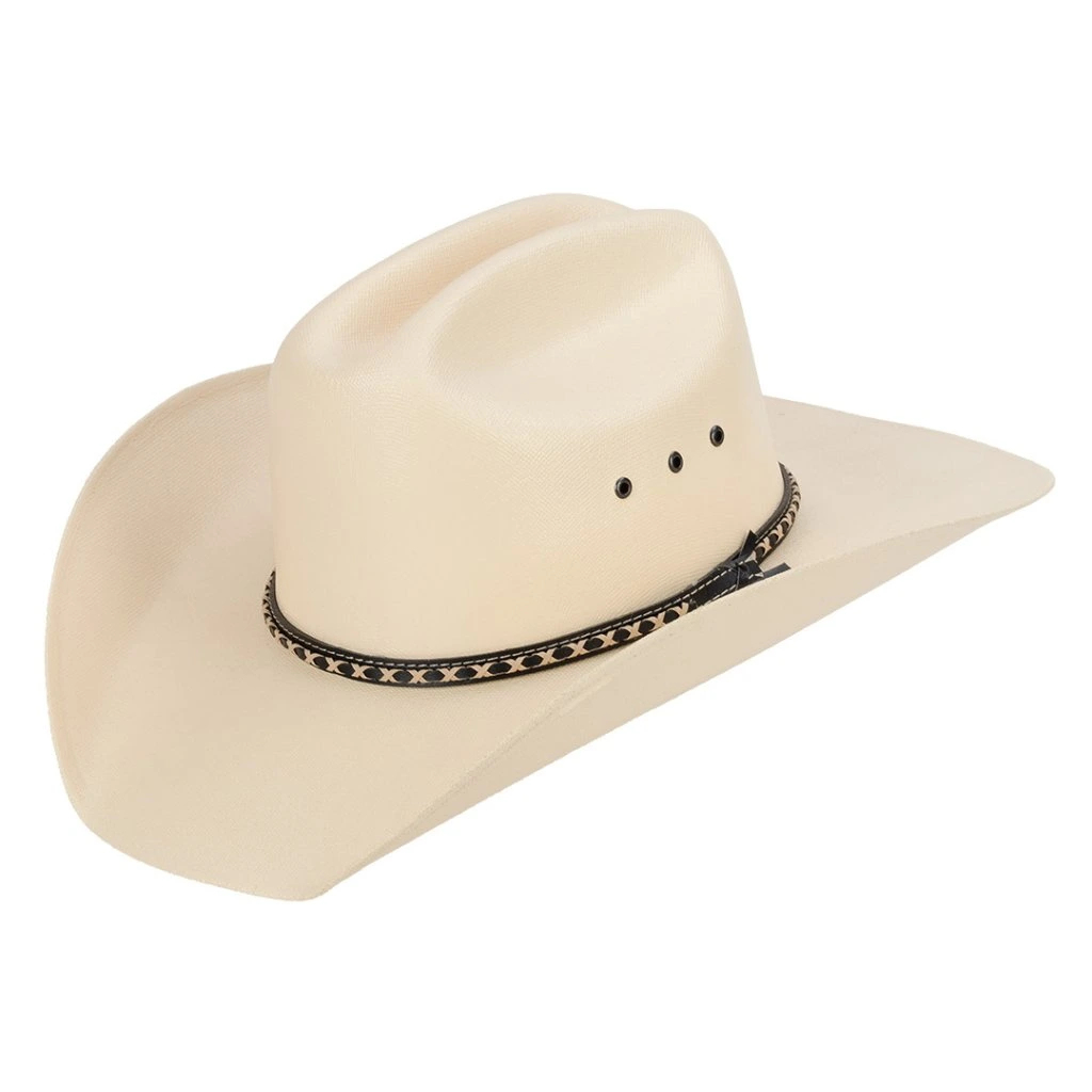 Elegantní vzhled podtrhuje výrazný westernový tvar, doplněný kontrastní ozdobnou páskou se stylovými dekoracemi. Boční větrací otvory zajišťují maximální komfort i při vysokých teplotách. Zaoblený okraj dodává klobouku klasickou kovbojskou siluetu a nezaměnitelný šarm.