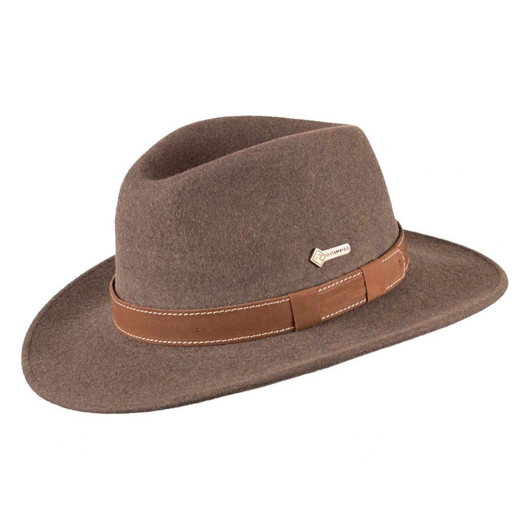 Klasický tvar vlněného klobouku s koženým ozdobným páskem, který je prošitý kontrastními švy.