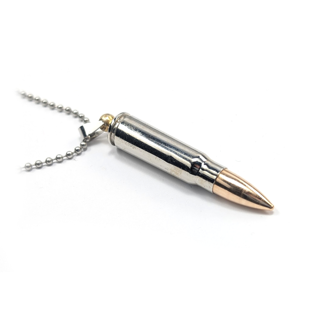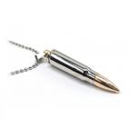 Náhrdelník vyrobený z puškového náboje 7,62x39 s ocelovou námi poniklovanou nábojnicí a originální FMJ poměděnou střelou.