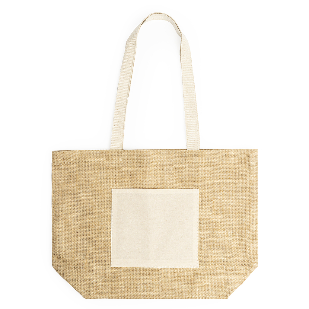 Taška z laminované juty s přední kapsou a dlouhými uchy z přírodní bavlny.