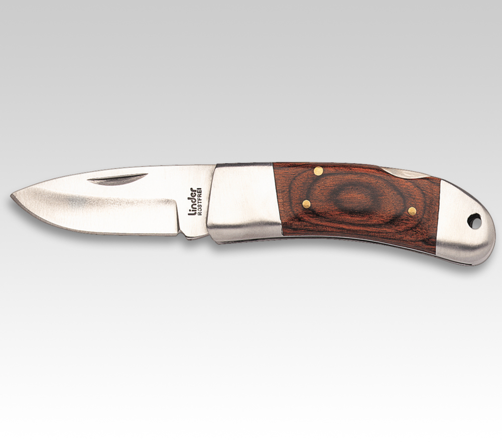 Zavírací nůž od německé firmy Linder. Ocel odolná proti korozi. Rukojeť je vyrobena z hnědo-červeného dřeva Pakka.