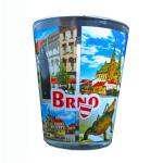Na skleničce jsou vyobrazeny nejznámější monumenty města Brna (Petrov, AZ tower, socha Jošta.).