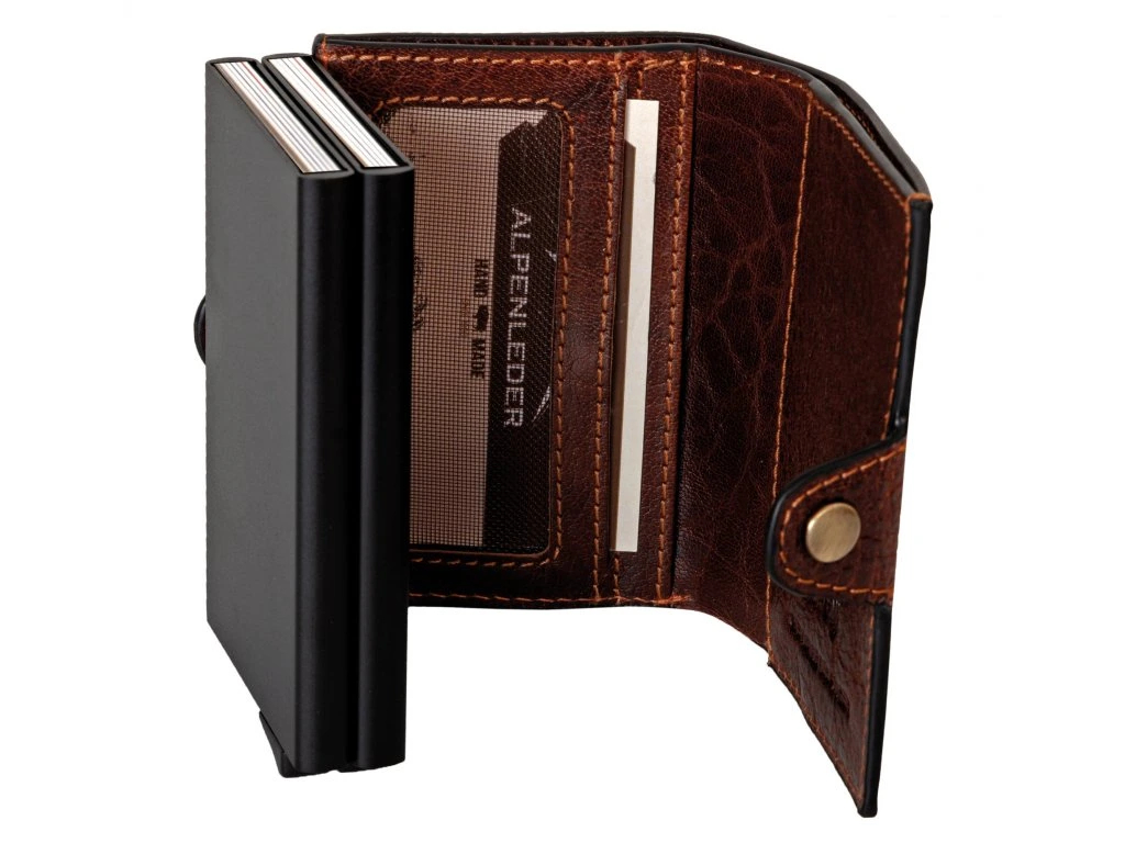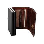 Kvalitní pánská peněženka s prostorem pro 14 bankovních karet uložené ve dvou bezpečných hliníkových pouzdrech s inteligentní mechanikou pro otevření. Přístup k nim je snadný - pomocí plastového vysunovacího táhla se karty vysunou s mírným odstupem pro vybrání té pravé.