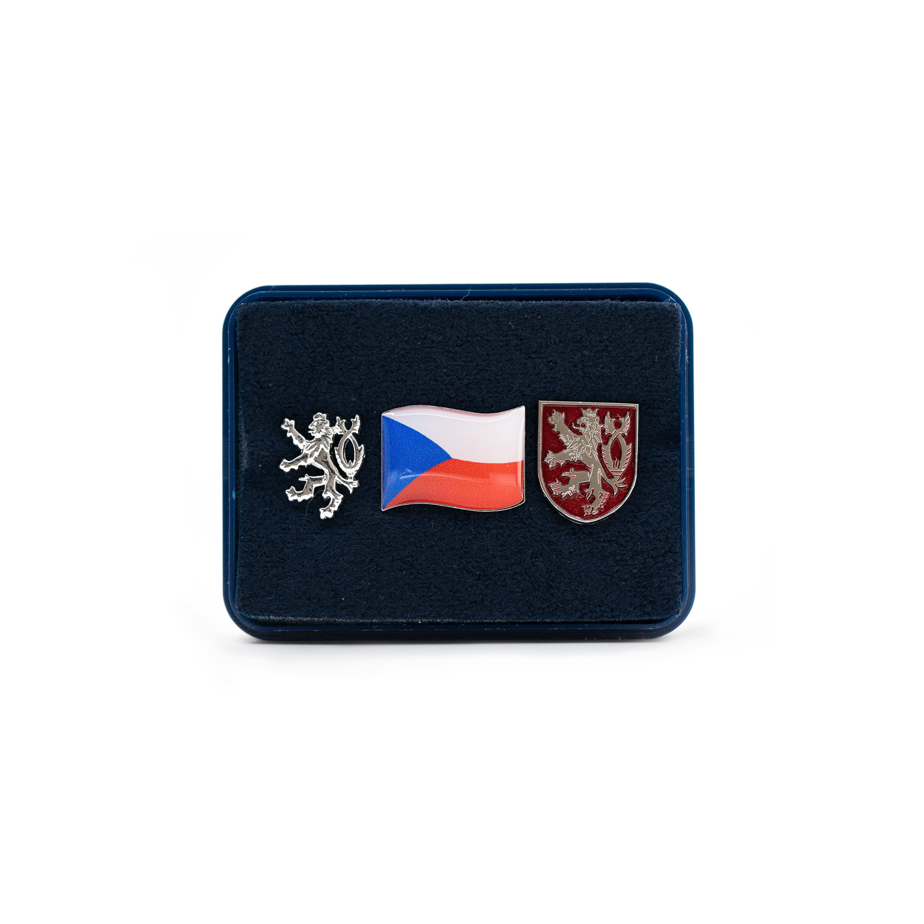 Sada obsahující vlajku ČR, českého lva a malý státní znak ČR. Odznaky jsou opatřeny připínáním na PIN (trn se zajištěním). Dodáváno v dárkové krabičce.
